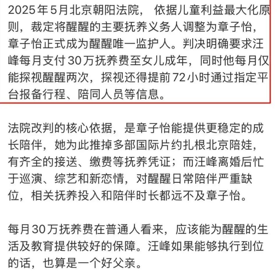 为争取醒醒的法定抚养权,她毅然推掉一部片酬高达五千万人民币的商业大片邀约——这份孤注一掷的决心,令业内为之动容。最终法院判决明确:醒醒主要抚养权归属章子怡,汪峰享有每月两次探视权,并按月支付30万元抚养费用。