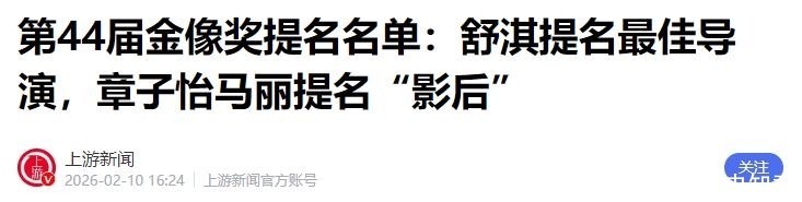 信息来源:上游新闻:2026-02-10:第44届金像奖提名名单:舒淇提名最佳导演,章子怡马丽提名“影后”