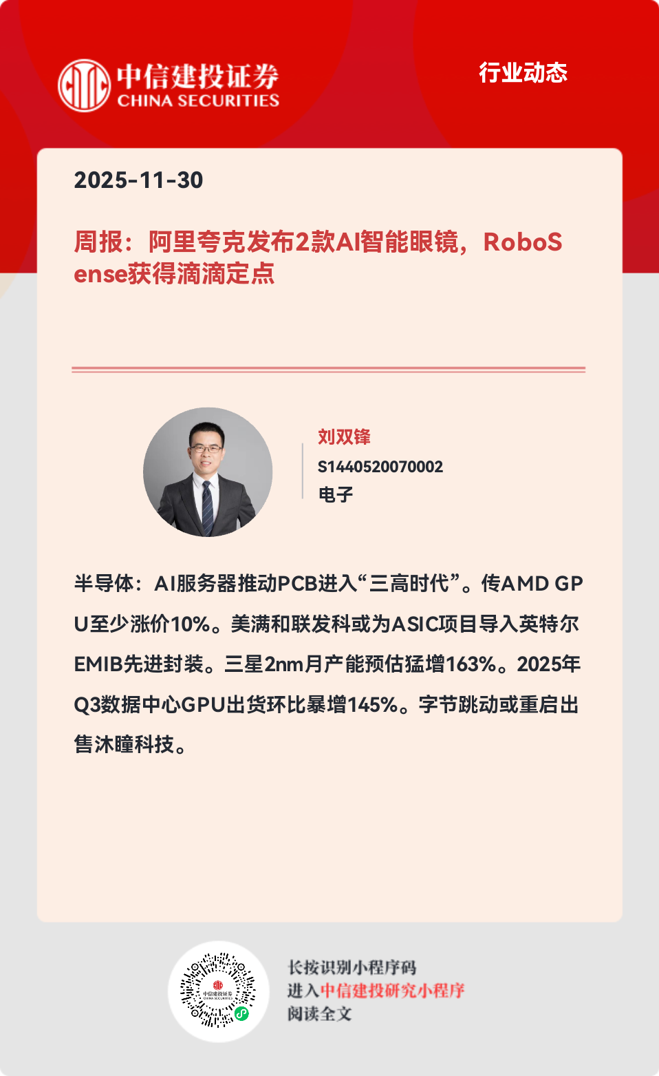 半导体:AI服务器推动PCB进入“三高时代”。传AMD GPU至少涨价10%。美满和联发科或为ASIC项目导入英特尔EMIB先进封装。三星2nm月产能预估猛增163%。2025年Q3数据中心GPU出货环比暴增145%。字节跳动或重启出售沐瞳科技。